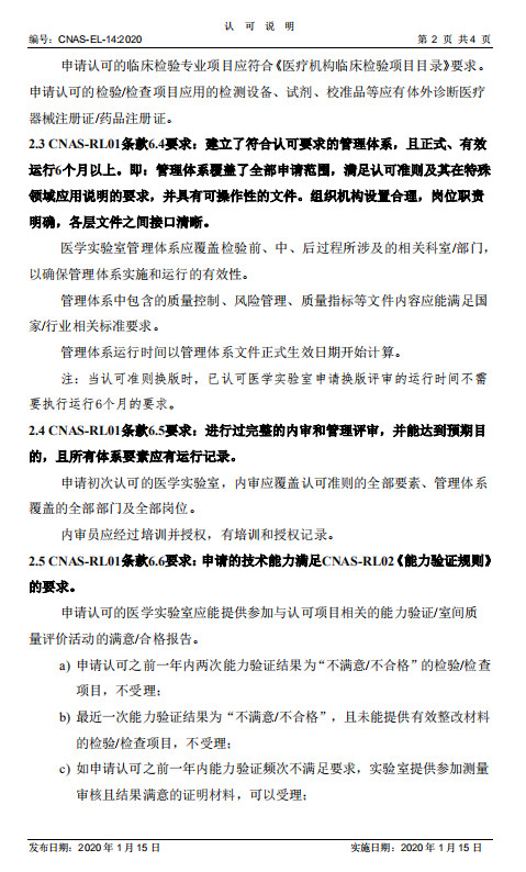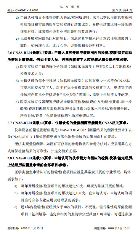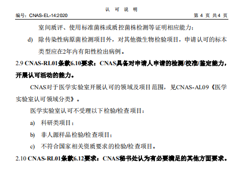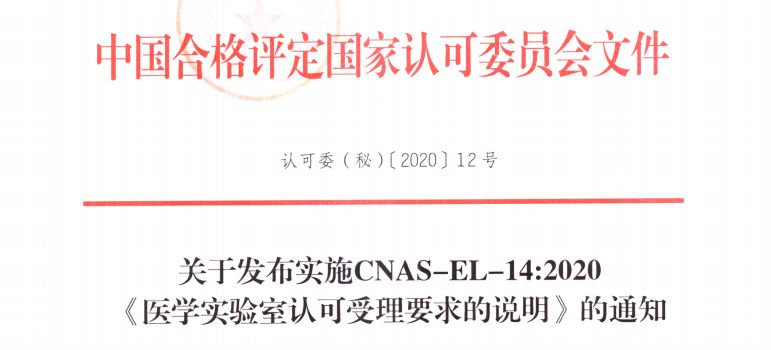 為明確醫(yī)學(xué)實(shí)驗(yàn)室認(rèn)可受理?xiàng)l件,促進(jìn)醫(yī)學(xué)實(shí)驗(yàn)室認(rèn)可制度順利實(shí)施,中國合格評(píng)定國家認(rèn)可委員會(huì)(CNAS)組織制定了CNAS-EL-14:2020《醫(yī)學(xué)實(shí)驗(yàn)室認(rèn)可受理要求的說明》,對(duì)CNAS-RL01《實(shí)驗(yàn)室認(rèn)可規(guī)則》第6章中關(guān)于認(rèn)可條件的相關(guān)要求進(jìn)行了說明。