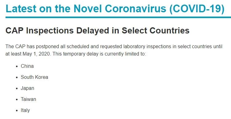 受新型冠狀病毒的影響,CAP推遲了之前所定的計劃,并要求至少到2020年5月1日后再開始對受疫情影響的國家的實驗室進行檢查。目前,因疫情影響延遲的國家有中國、韓國、日本、臺灣和意大利。根據疫情的發(fā)展,受影響的國家可能會發(fā)生變化。但是在此期間,受影響的實驗室仍需保持CAP認證,為了保持質量和安全,受影響的實驗室應繼續(xù)參與PT項目并遵守CAP的所有要求。
