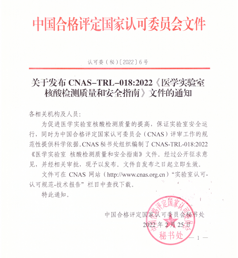為促進(jìn)醫(yī)學(xué)實(shí)驗(yàn)室核酸檢測(cè)質(zhì)量的提高,保證實(shí)驗(yàn)室安全運(yùn)行,同時(shí)為CNAS評(píng)審工作的規(guī)范性提供科學(xué)依據(jù)。CNAS 秘書處組織編制了CNAS-TRL-018:2022《醫(yī)學(xué)實(shí)驗(yàn)室核酸檢測(cè)質(zhì)量和安全指南》文件。經(jīng)過公開征求意見,并經(jīng)相關(guān)審批,現(xiàn)予以發(fā)布。文件自發(fā)布之日起立即生效。文件可在 CNAS 網(wǎng)站“實(shí)驗(yàn)室認(rèn)可﹣認(rèn)可規(guī)范﹣技術(shù)報(bào)告”欄目中查找下載。