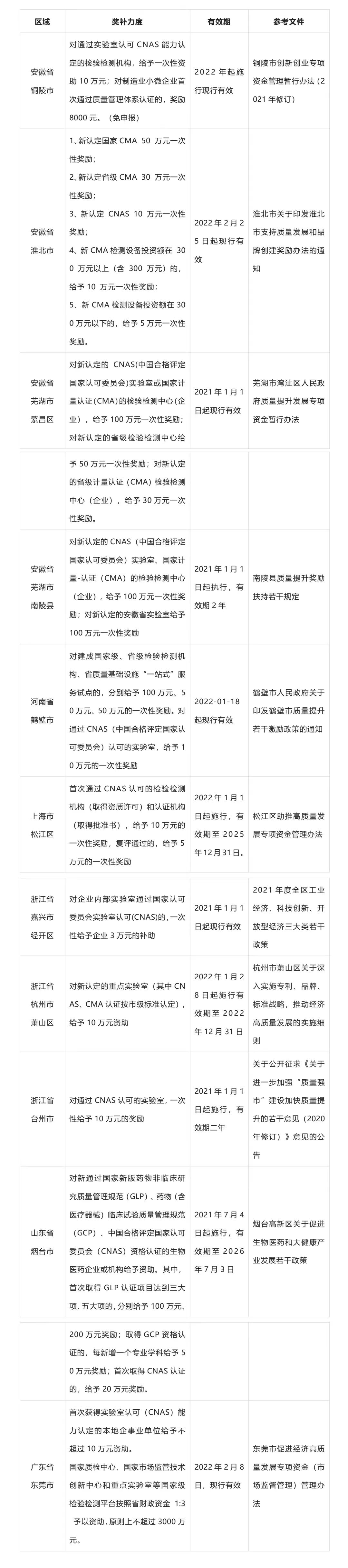 近期,隨著國務院印發(fā)《“十四五”市場監(jiān)管現(xiàn)代化規(guī)劃》,提高質量認證服務能力與加大認可和檢驗檢測改革創(chuàng)新力度被上升到國家層面,其中重點提及規(guī)劃建設一批高水平國家質檢中心和檢測實驗室?,F(xiàn)對CNAS、CMA認證補貼相關獎勵政策做了搜集整理,詳情如下: