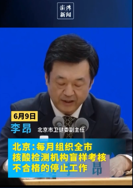 北京市想出了一個新招。6月9日,北京市宣布每月對核酸檢測公司進行一次盲樣考核,不合格的停止核酸檢測工作,整改合格后才允許繼續(xù)營業(yè)。