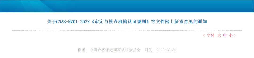 為確保上述文件的適宜性,現(xiàn)于CNAS網(wǎng)站上征詢意見或建議。相關(guān)機(jī)構(gòu)及人員如對(duì)上述文件有意見或建議,請(qǐng)?zhí)顚懜郊械摹禖NAS文件意見征詢表》,并于2022年9月13日前反饋至CNAS秘書處。
