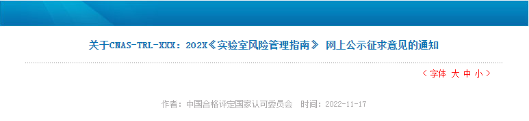 中國合格評定國家認(rèn)可中心(CNAS)組織編制了技術(shù)報(bào)告《實(shí)驗(yàn)室風(fēng)險(xiǎn)管理指南》。目前已完成文件征求意見稿,現(xiàn)于網(wǎng)上公示征求意見。