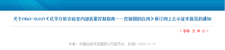 中國合格評定國家認(rèn)可委員會(huì)(CNAS)組織修訂了CNAS-GL027《化學(xué)分析實(shí)驗(yàn)室內(nèi)部質(zhì)量控制指南——控制圖的應(yīng)用》。目前已完成文件征求意見稿,現(xiàn)于網(wǎng)上公示征求意見。