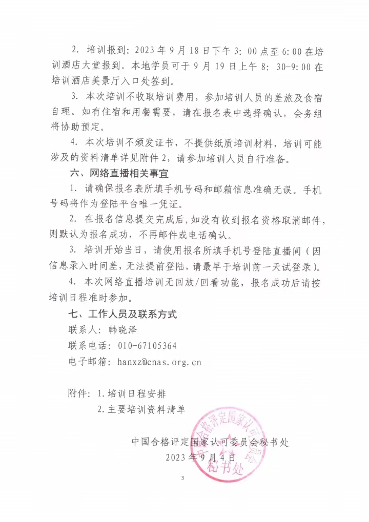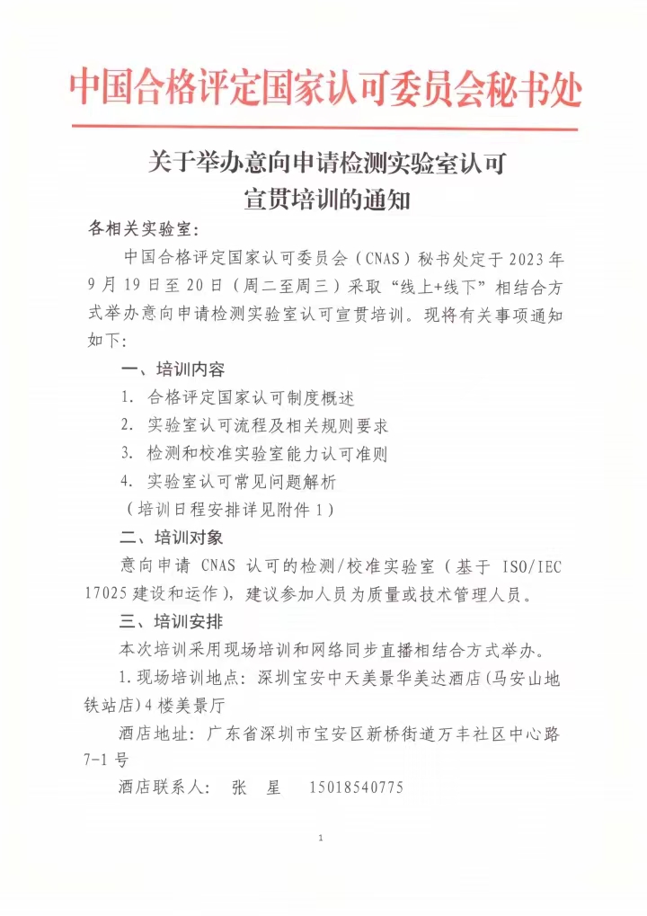 中國合格評定國家認可委員會(CNAS)秘書處定于2023年9月19日至20日(周二至周三)采取“線上+線下”相結合方式舉辦意向申請檢測實驗室認可宣貫培訓。現(xiàn)將有關事項通知如下: