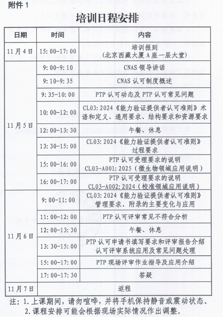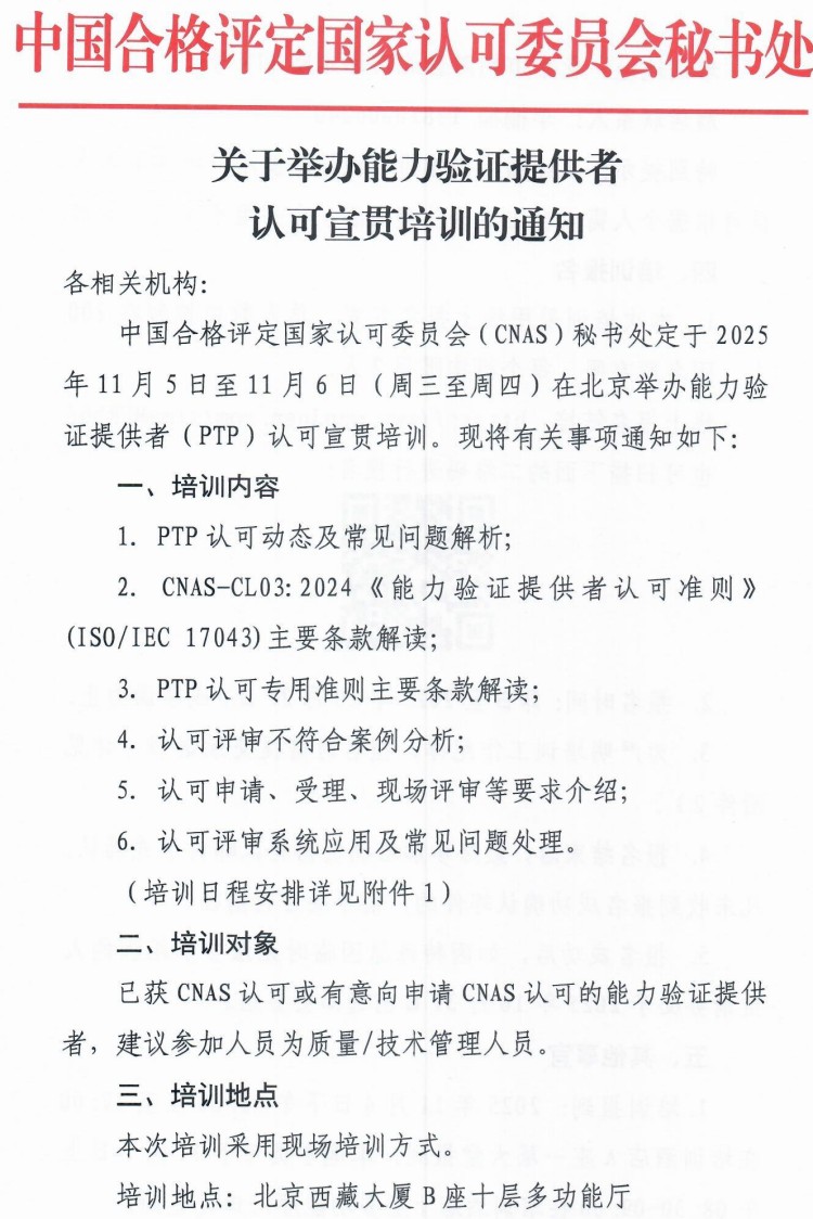 中國合格評定國家認可委員會(CNAS)秘書處定于2025年11月5日至11月6日在北京舉行能力驗證提供者(PTP)認可宣貫培訓,培訓內容包括PTP認可動態(tài)及常見問題分析、CNAS-CL03:2024《能力驗證提供者認可準則》主要條款解讀、PTP認可專用準則主要條款解讀等內容,歡迎已獲CNAS認可或意向申請CNAS認可的能力驗證提供者報名。